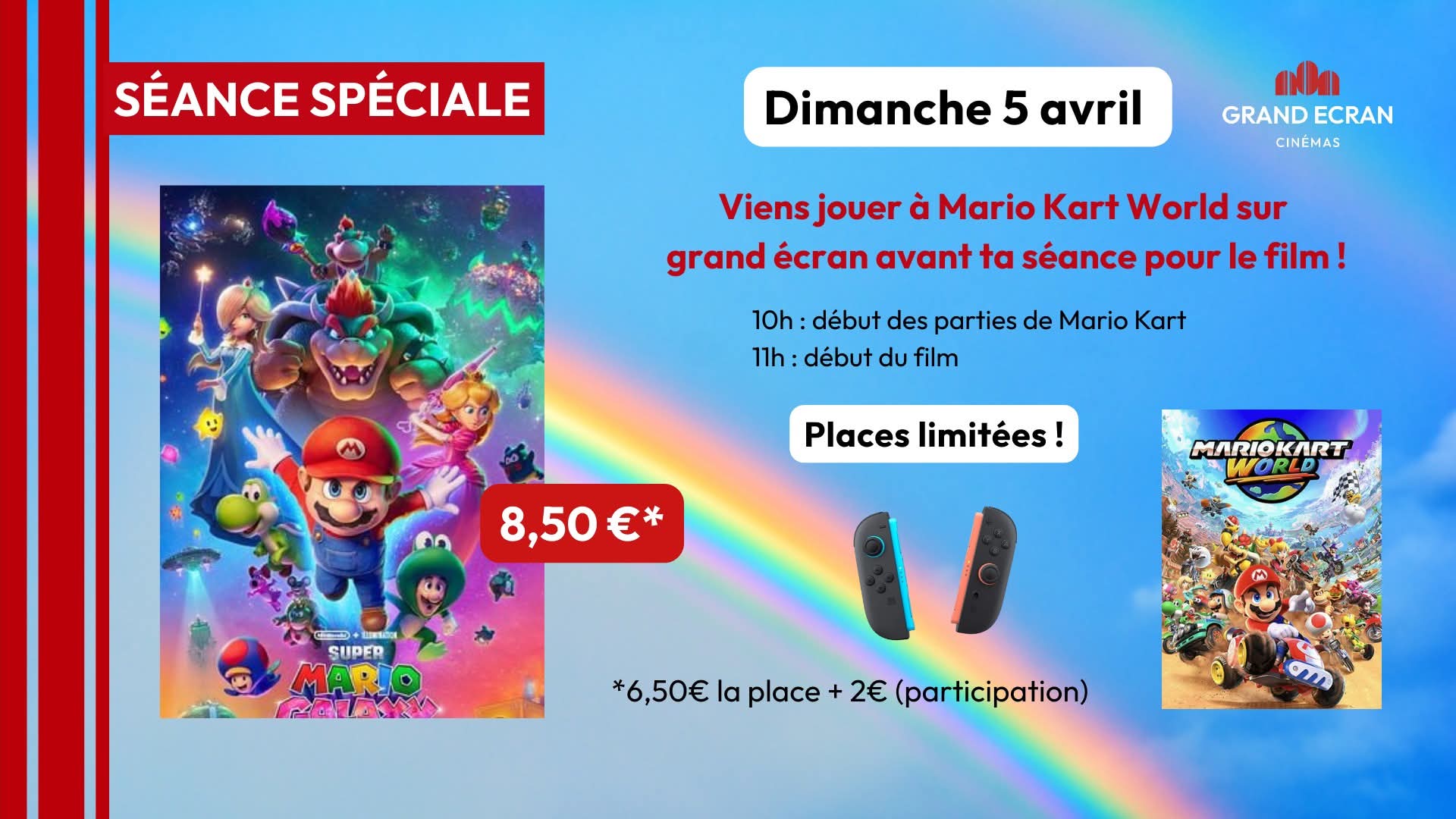 Film : 6,50€ + 2€ de participation pour l’inscription à la partie de Mario Kart World (option à choisir à l’étape du paiement)